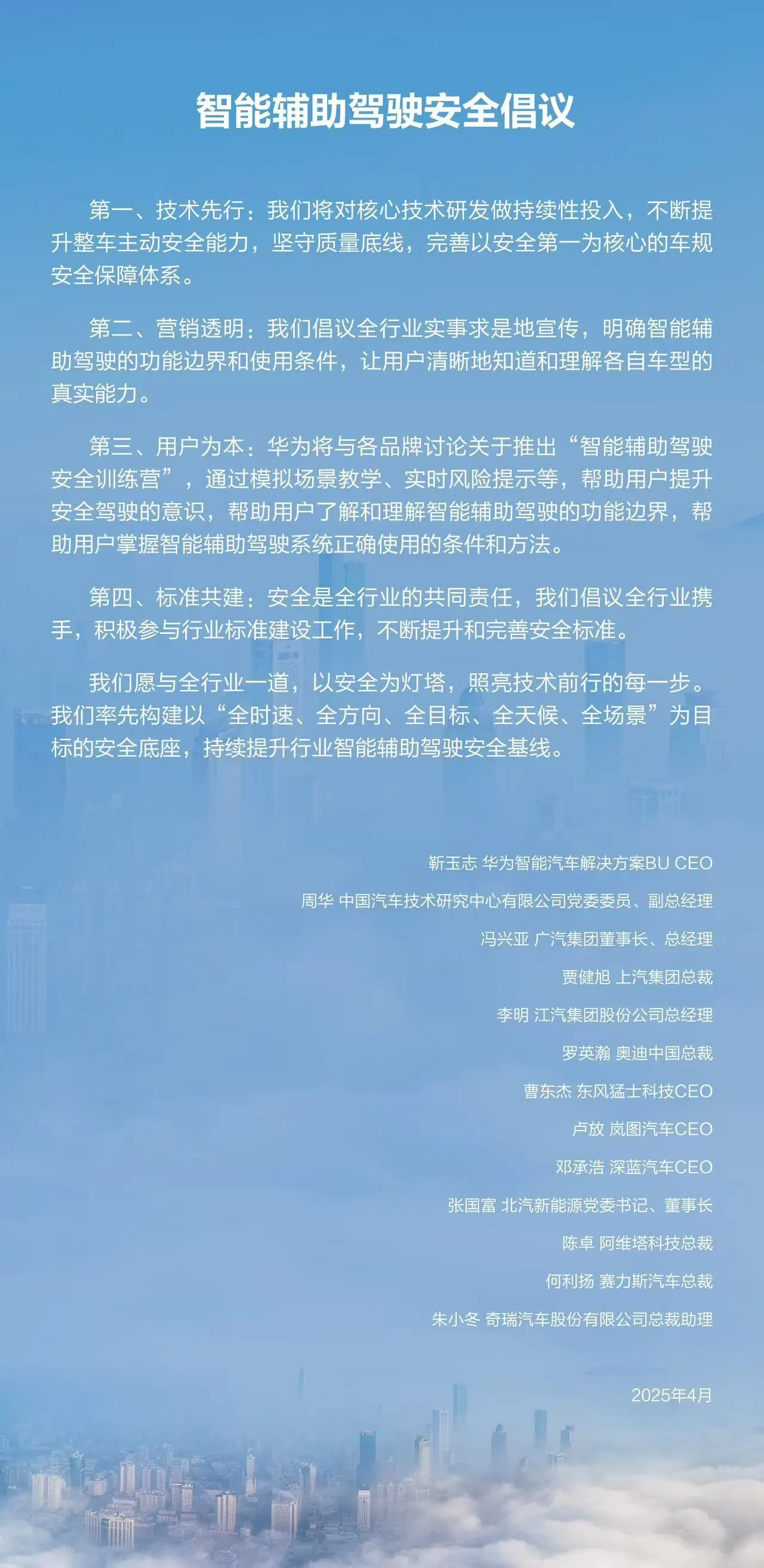 4 月 27 日,华为、广汽、上汽、江汽、奥迪、东风猛士、岚图、深蓝汽车、北汽、阿维塔、赛力斯(601127)、奇瑞汽车的高管联合发布《智能辅助驾驶安全倡议》,倡议全行业携手,积极参与行业标准建设工作,不断提升和完善安全标准。