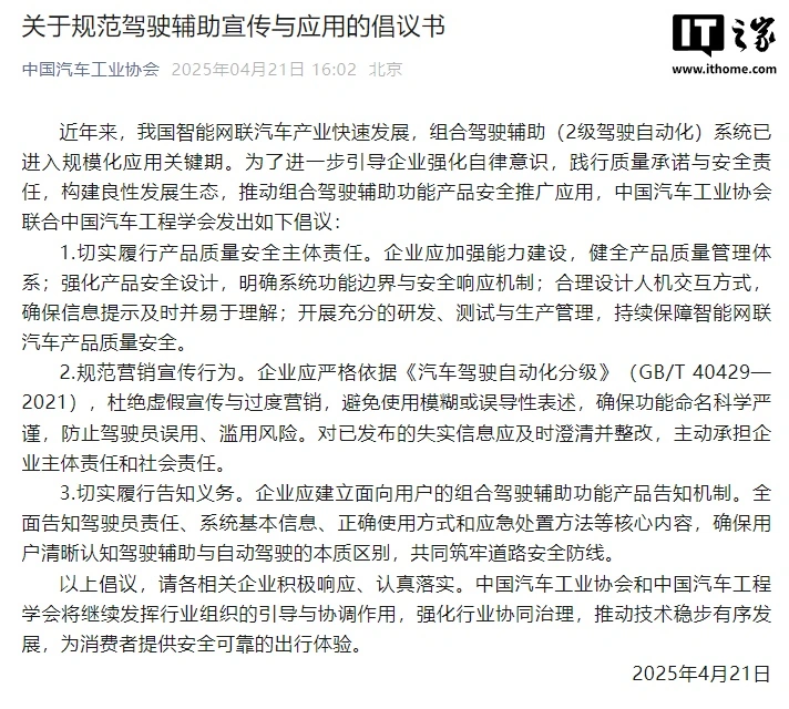 据IT之家此前报道,今年 4 月,中国汽车工业协会发布《关于规范驾驶辅助宣传与应用的倡议书》,提到杜绝虚假宣传与过度营销,避免使用模糊或误导性表述,确保功能命名科学严谨,防止驾驶员误用、滥用风险。
