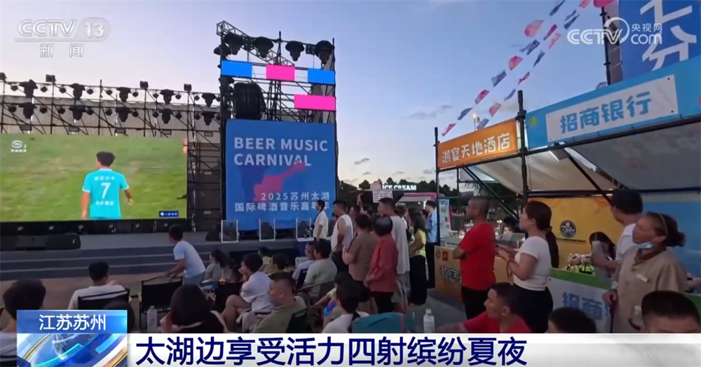在江苏苏州太湖之滨,一方巨幕临水而立,临湖广场化身城市“会客厅”,吸引游客欢聚一堂,既可以观看赛事直播、音乐表演,也可以一边品美食、喝啤酒,享受活力四射的缤纷夏夜。