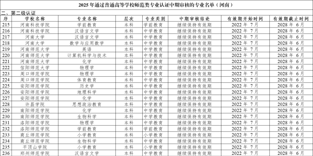 经高校申请、教育评估机构组织专家考查、普通高等学校师范类专业认证专家委员会审定,华东师范大学英语专业等17个专业通过第三级专业认证,中华女子学院学前教育专业等576个专业通过第二级专业认证,认证结论有效期六年,自2025年9月起至2031年8月止。经高校提交整改材料、专家审查、普通高等学校师范类专业认证专家委员会审定,北京师范大学化学专业等386个专业通过了师范类专业认证中期审核,继续保持原认证有效期。
