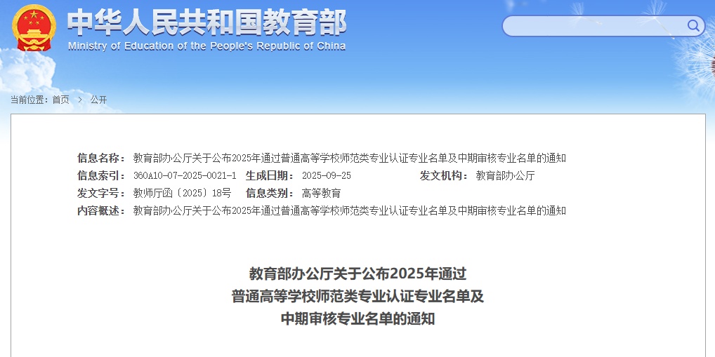 近日股票安全配资,教育部办公厅发布《关于公布2025年通过普通高等学校师范类专业认证专业名单及中期审核专业名单的通知》。