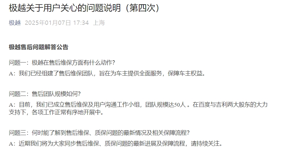 极越汽车:已成立50人售后维保工作小组,获百度与吉利支持