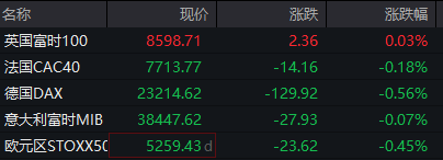 德国DAX指数跌0.56%,法国CAC40指数跌0.18%,英国富时100指数涨0.03%。